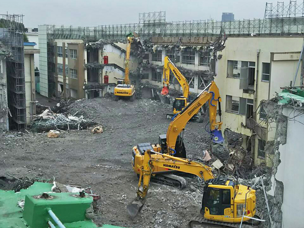 建物の主要構造体(コンクリート造・鉄骨造)を解体重機に専用アタッチメントを取り付けて取り壊していきます。